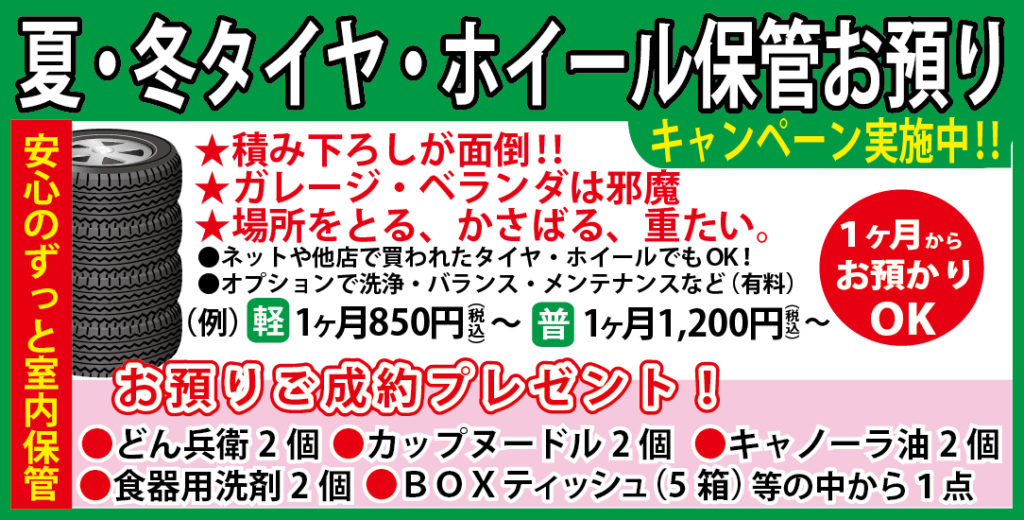 タイヤ・ホイール保管お預りで選べる粗品プレゼント実施中!! 日頃よりご利用ありがとうございます。 ただいま、タイヤ・ホイール保管お預りで選べる粗品プレゼントキャンペーン実施中です!! ぜひこの機会に、タイヤ・ホイール保管お預りをご利用ください。